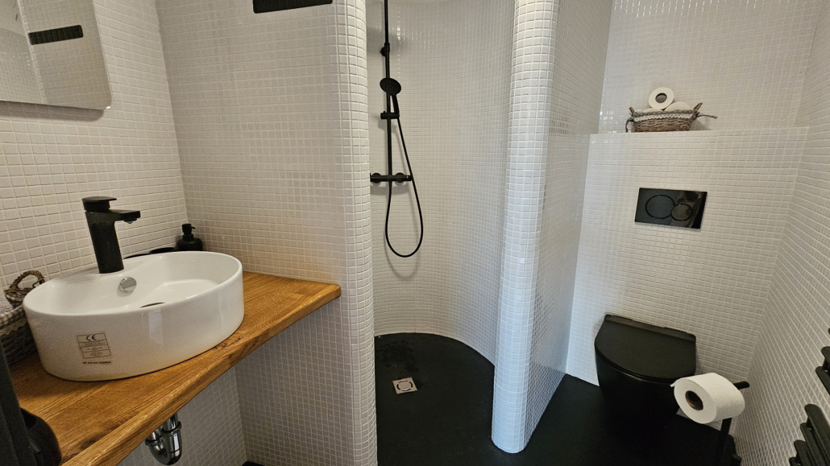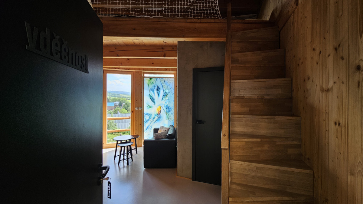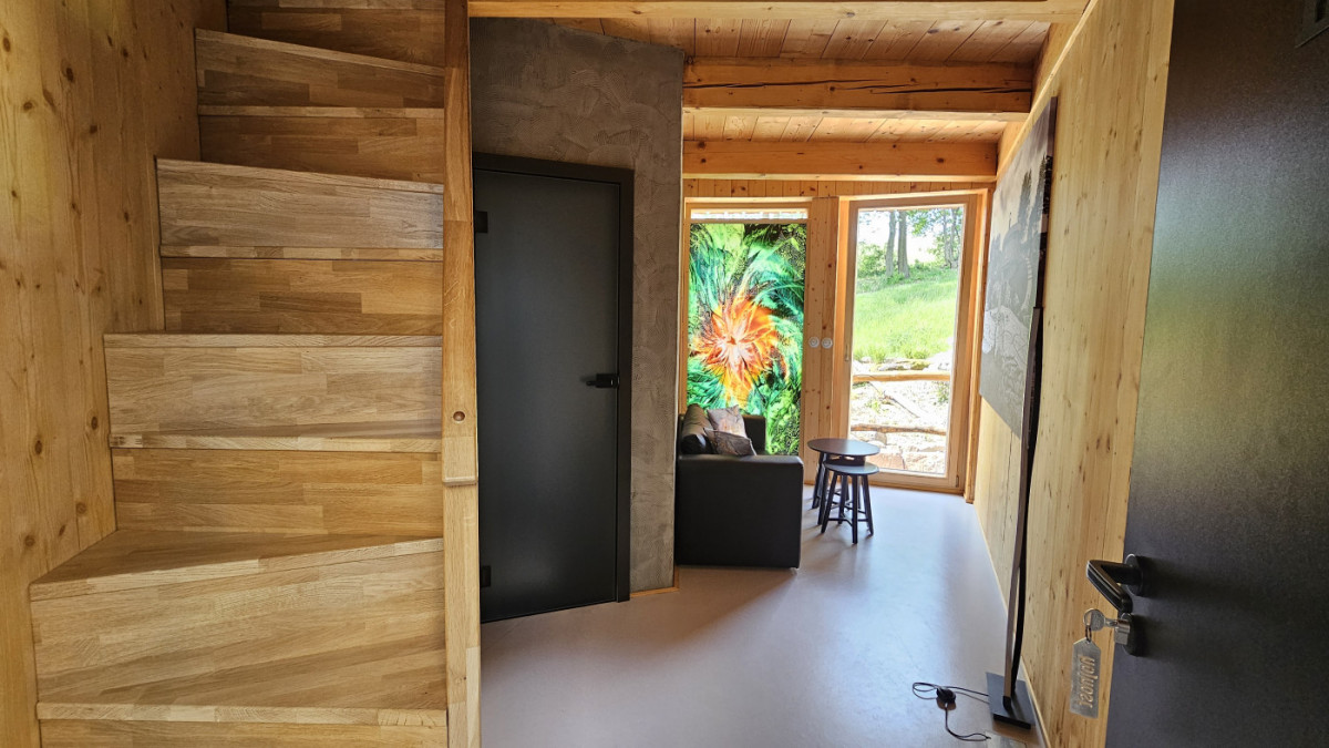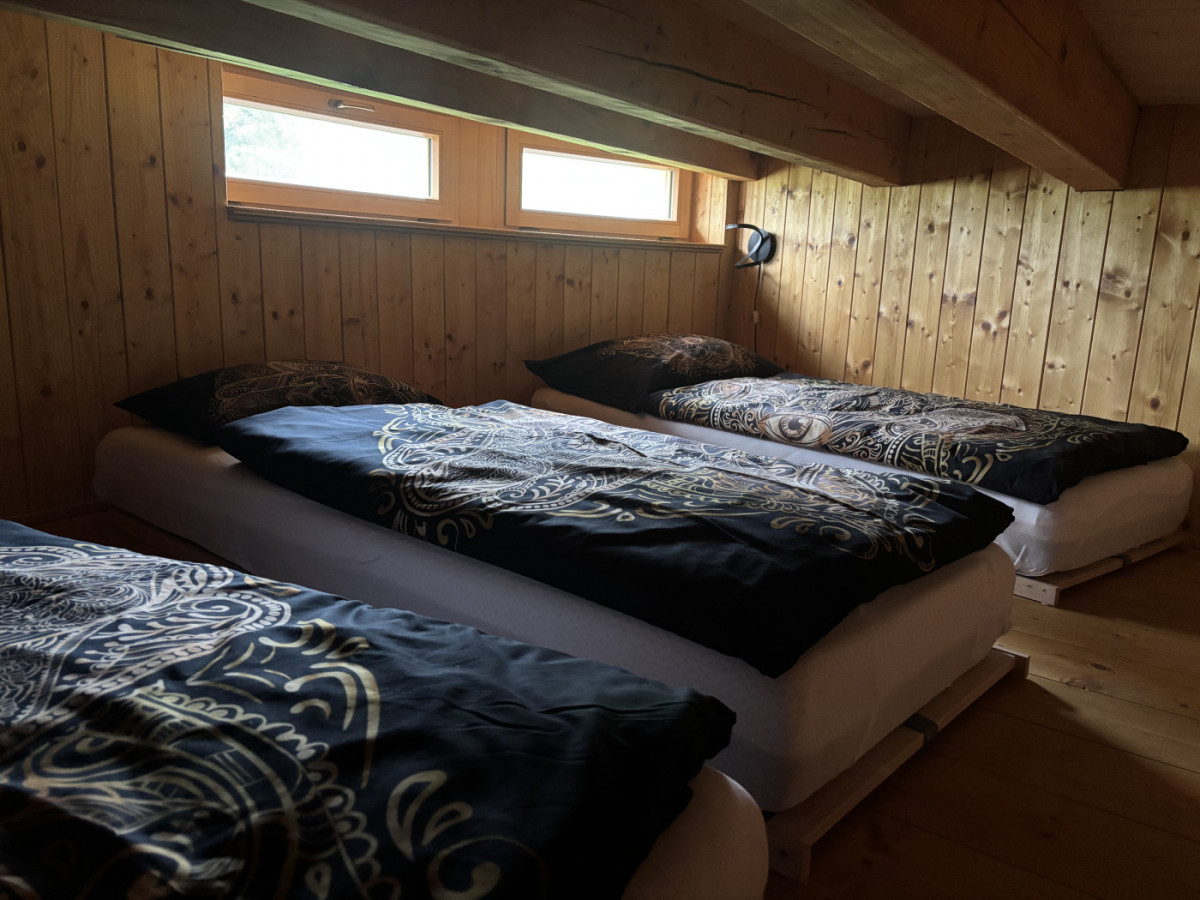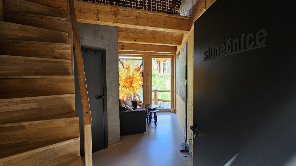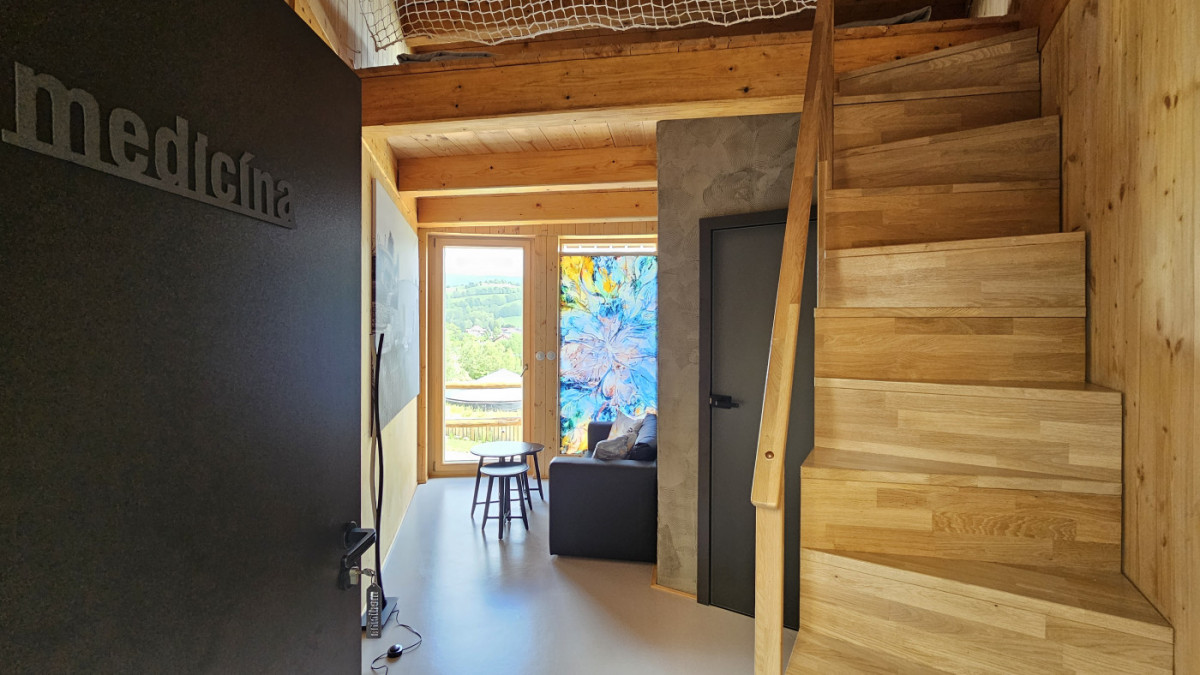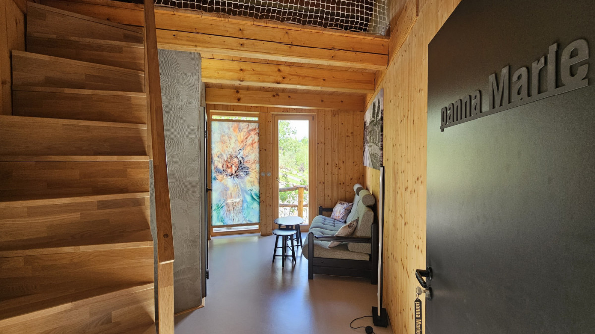 Každý pokoj je vybaven třemi matracemi, které jsou umístěny vedle sebe na roštu. Místo pro spánek a odpočinek se nachází v patře, kam se vstupuje po schodech. Součástí dolního pokojíku je rozkládací gauč - přistýlka, sprchový kout a toaleta. Z každého pokoje, je možné vyjít na pochozí terasu.