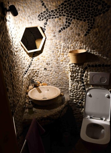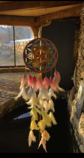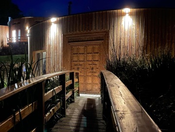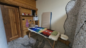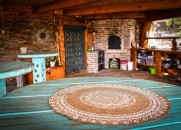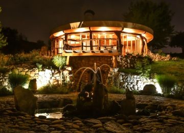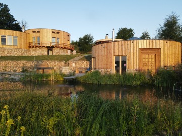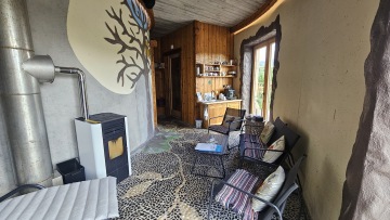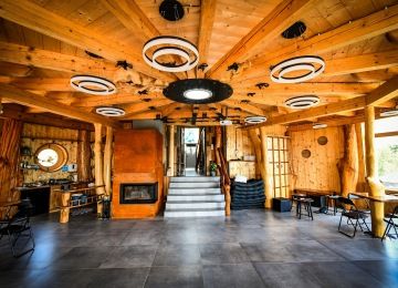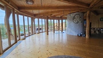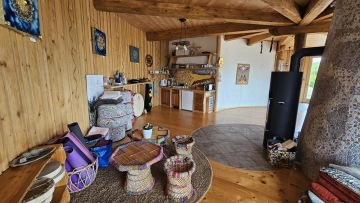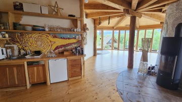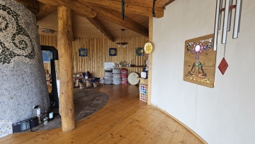 Celý prostor je kruhového půdorysu, který je rozdělen středovým sloupem. Součástí domu jsou kamna, kuchyňka, sprcha + wc. Kuchyňka je vybavená nádobím, rychlovarnou konvicí, malou ledničkou, myčkou, kávovarem. Vodu si můžete dopřát naši studánkovou nebo z přístroje Kangen. Tento prostor je ideální na jógy, meditace, tanec, ale i další akce.