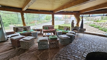 Součástí domu je velký stůl až pro 12 osob, taburetky a stolky.
