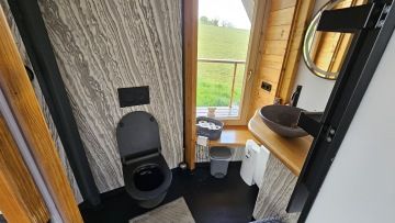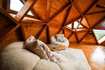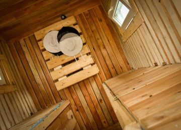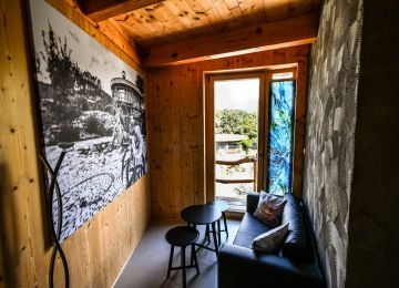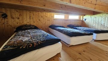 Každý pokoj je vybaven třemi matracemi , které jsou umístěny vedle sebe na roštu. Místo pro spánek a odpočinek se nachází v patře, kam se vstupuje po schodech. Součástí pokojíku je rozkládací gauč - přistýlka, sprchový kout a toaleta. Z každého pokoje, je možné vyjít na pochuznou terasu.