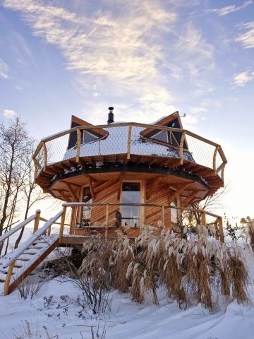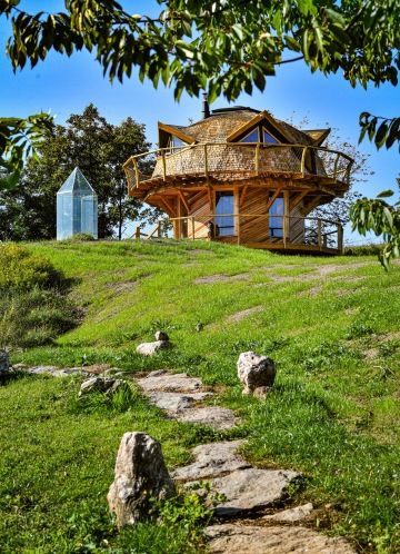 Samotný domek je kruhový, konopný a stavěný dle principů posvátné geometrie. Vstup je po schodišti a domek je patrový, není tedy bezbariérový.