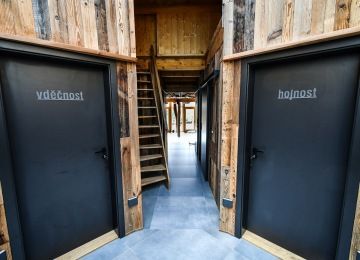 Ubytování s pejskem je možné pouze ve Srubu a vstup do Zahrady živlů pouze na vodítku.